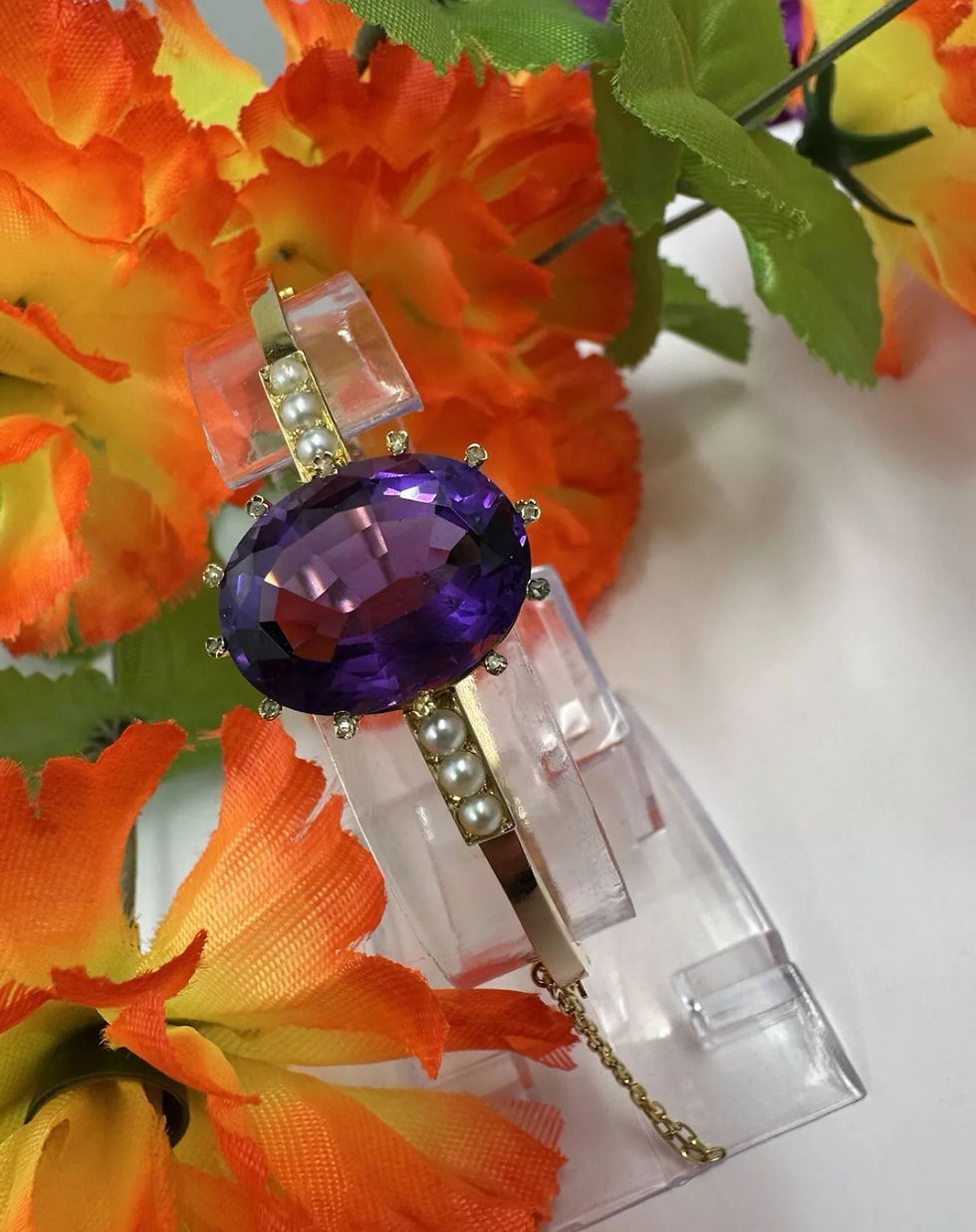 Exquisite Amethyst, Diamond & Pearl 15ct Yellow Gold Bangle